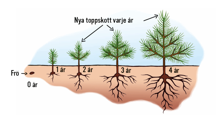 På stubbar kan du se hur gammalt trädet var när det höggs ner. Räkna ett år för varje ljus och mörk ring bredvid varandra. Den ljusa ringen bildas på våren när trädet dricker mycket vatten, den mörka på hösten när trädet dricker mindre.