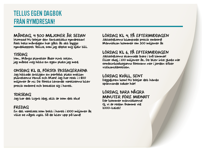 Om vi låtsas att en dag under Tellus rymdresa är 750 miljoner år lång, så tog hela den långa resan från dagen då planeten skapades – fram till idag - ungefär en vecka. Om Tellus hade skrivit dagbok om rymdresan, kanske det hade stått så här…