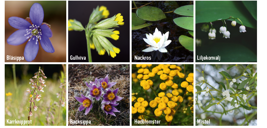 En del växter och blommor i naturen är fridlysta. Det betyder att man inte får plocka dem, eftersom det finns så få av dem. En blomma kan vara fridlyst på en ort men inte på en annan. En del blommor får man plocka men inte dra upp med rötterna. Det bästa är alltid att fråga en vuxen innan du plockar en blomma. Alla blommor som du ser här, är fridlysta.