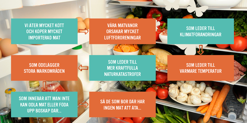 Vad händer om vi byter ut den första rutan i orsak- och konsekvenskedjan om våra matvaror? Hur skulle det påverka nästa ruta – och nästa?