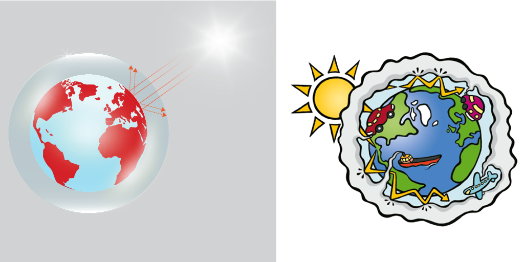När för mycket av dessa gaser släpps ut i luften lägger de sig som ett koldioxidtak runt planeten. Solens värme, som annars brukar studsa tillbaka ut i rymden, stängs då in av jordens atmosfär. Det blir varmare, de stora isarna smälter och havsnivån stiger. Det kallas för global uppvärmning eller växthuseffekten.