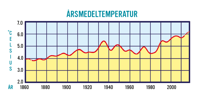 Klimatet har förändrats i hela världen. I Sverige har det förändrats ganska mycket. Sedan vi började mäta temperaturen på 1880-talet har genomsnittstemperaturen i världen ökat med 1,3 grader. De senaste 30 åren har Sveriges årsmedeltemperatur ökat dubbelt så snabbt som genomsnittet på jorden.