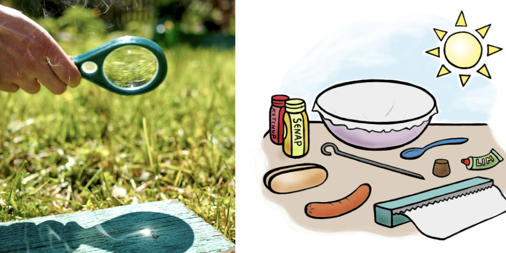 Gör så här: Täck skålens insida med folie. Platta ut folien med skeden så jämt du kan. Ta bort en bit av folien i mitten av skålens botten, limma fast korken där. Trä en korv på grill spettet, fäst grillspettet i korken. OBS! Korven måste vara inne i skålen. Rikta skålen mot solen – snart är korven grillad.