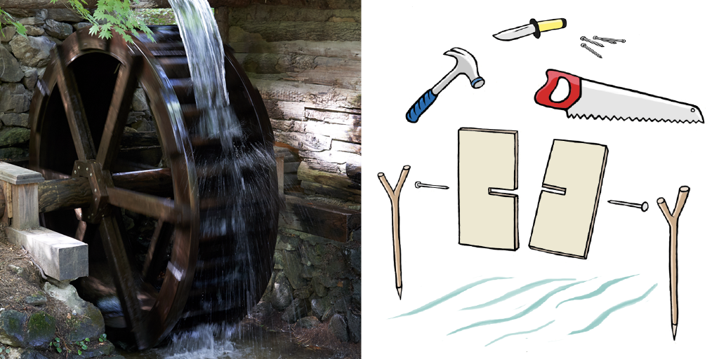 Gör så här: Såga ett jack i plankorna, som i bilden. Spika ihop de två (50 cm långa) plankorna så att de går in i varandra och bildar ett ”x”. Sätt ner klykorna på varsin sida av en bäck. Häng upp vattenhjulet på klykorna med hjälp av de stora spikarna. Vatten hjulet kommer snart att börja snurra.