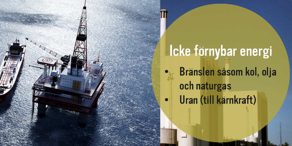 Energi kan delas in i grupperna förnybar och icke-förnybar. Förnybar energi är energiformer som förnyas eller cirkulerar och omvandlas i vårt ekologiska system. Solen ger solenergi så länge den strålar, varje ny vindpust blåser liv i vindkraftverk och det ständigt forsande vattnet får generatorerna att snurra i vattenkraftverken. På samma sätt växer växter i solen och kan omvandlas till bioenergi.